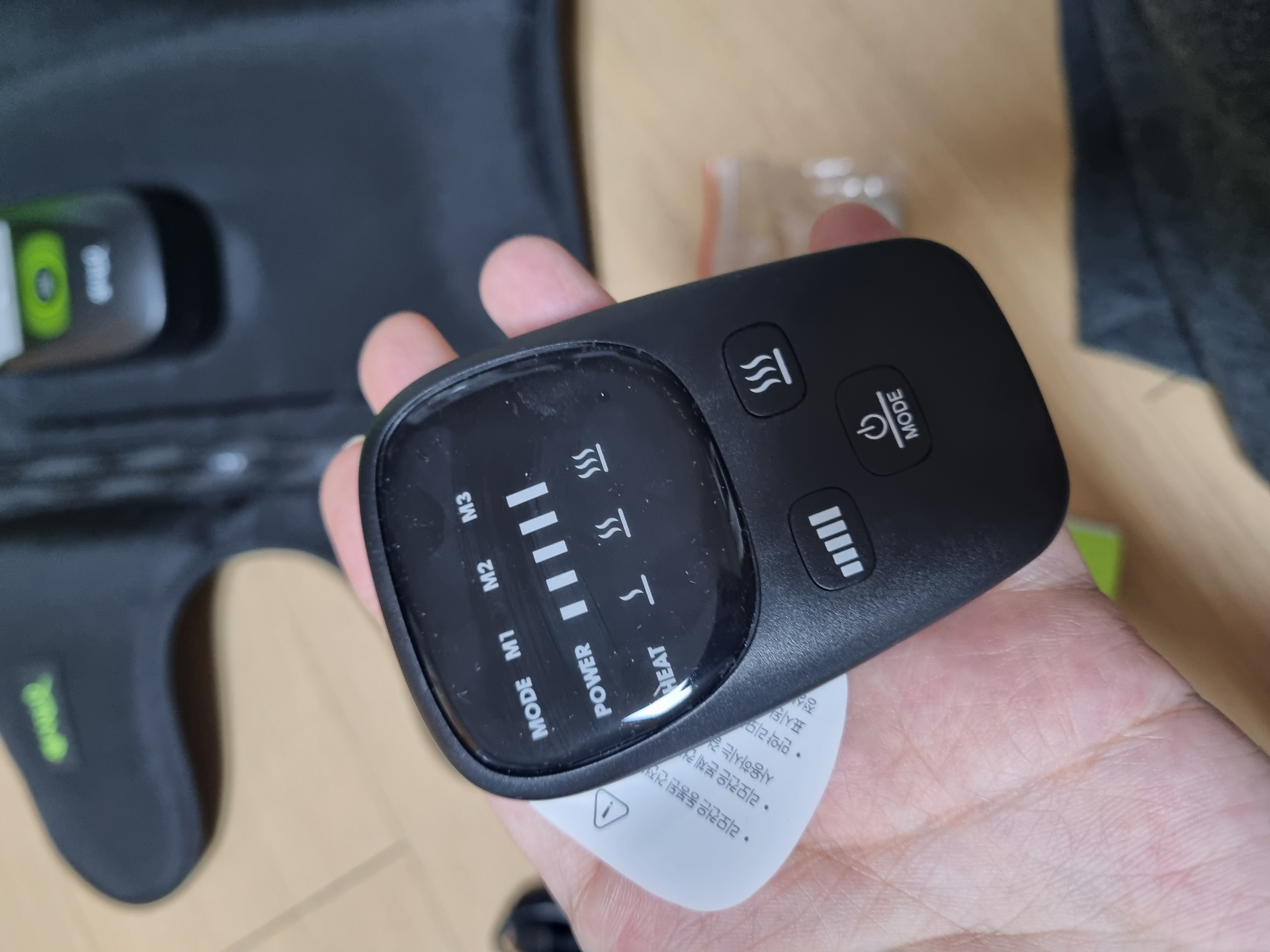 본품에 리모컨은 탈부착 스타일로 강도, 온열, 마사지 모드를 변경할 수 있어요.